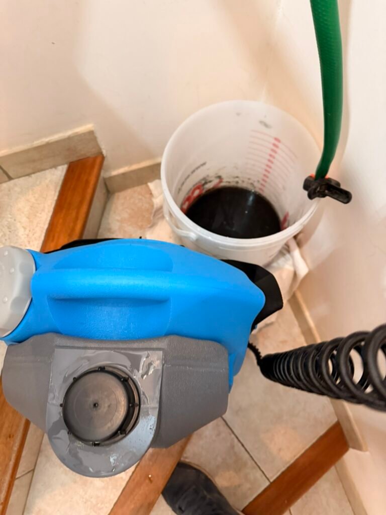 Plutôt que d’improviser, j’ai préféré revenir le lendemain matin tôt, avant d’autres clients déjà planifiés ce samedi-là, afin de réaliser l’intervention dans de bonnes conditions. La climatisation n’avait jamais été nettoyée, et cela se voyait clairement au moment du nettoyage, notamment à la couleur très noire de l’eau récupérée.
