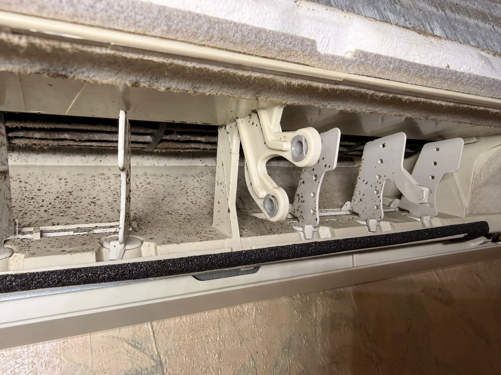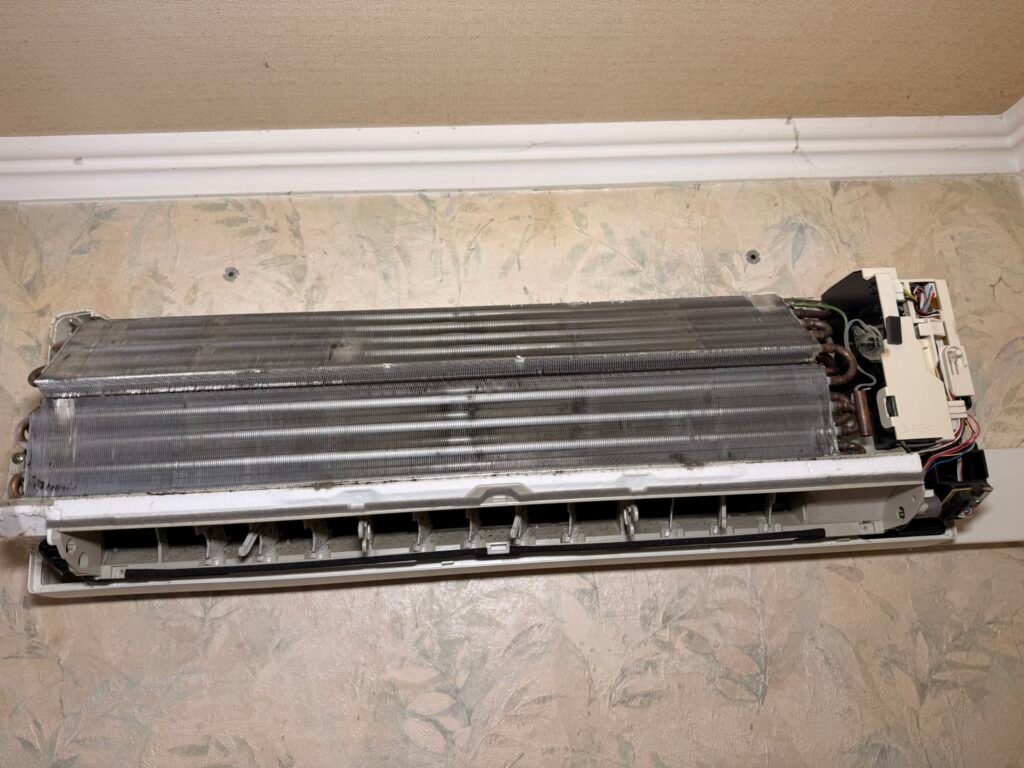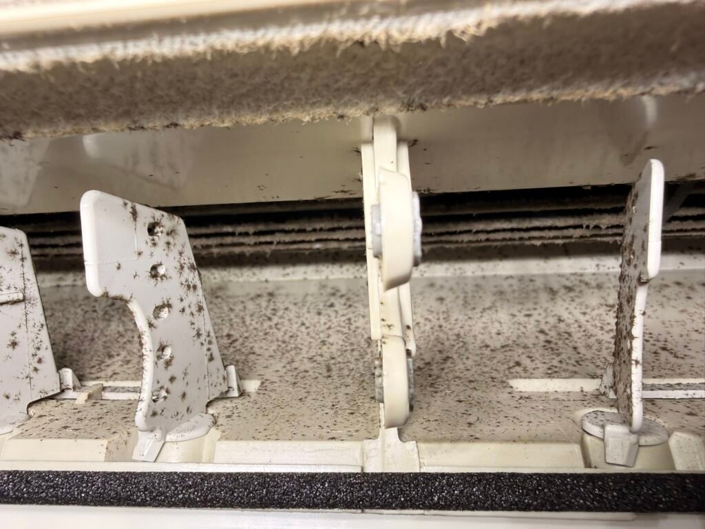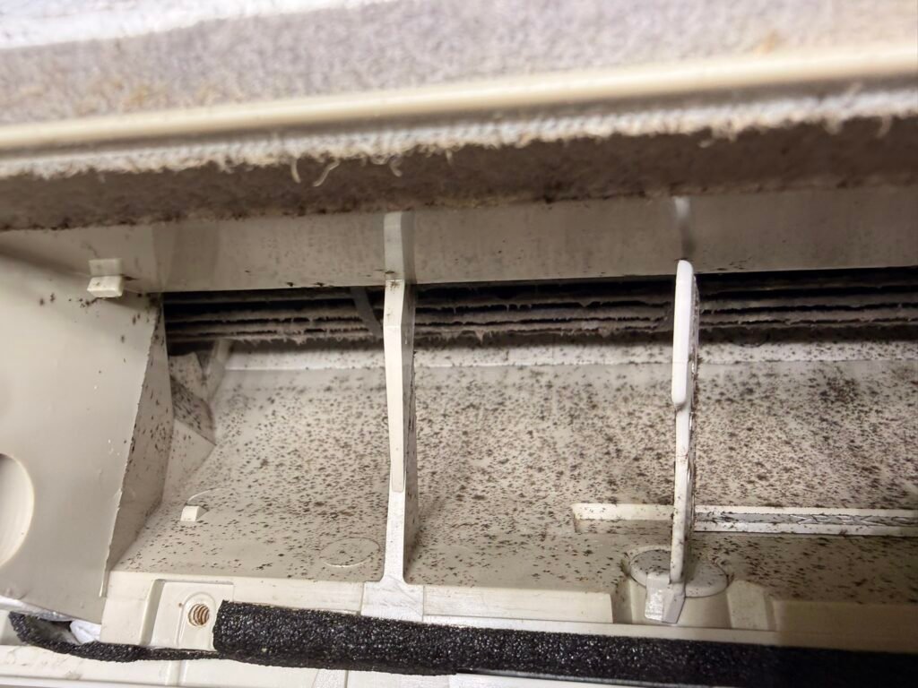 Sans surprise, l’état intérieur de la climatisation montrait un encrassement très important. Ce genre de situation demande de prendre le temps nécessaire, sans chercher à aller trop vite. L’objectif était clair : remettre l’appareil dans un état nettement plus propre, avec un nettoyage approfondi, réalisé sérieusement.